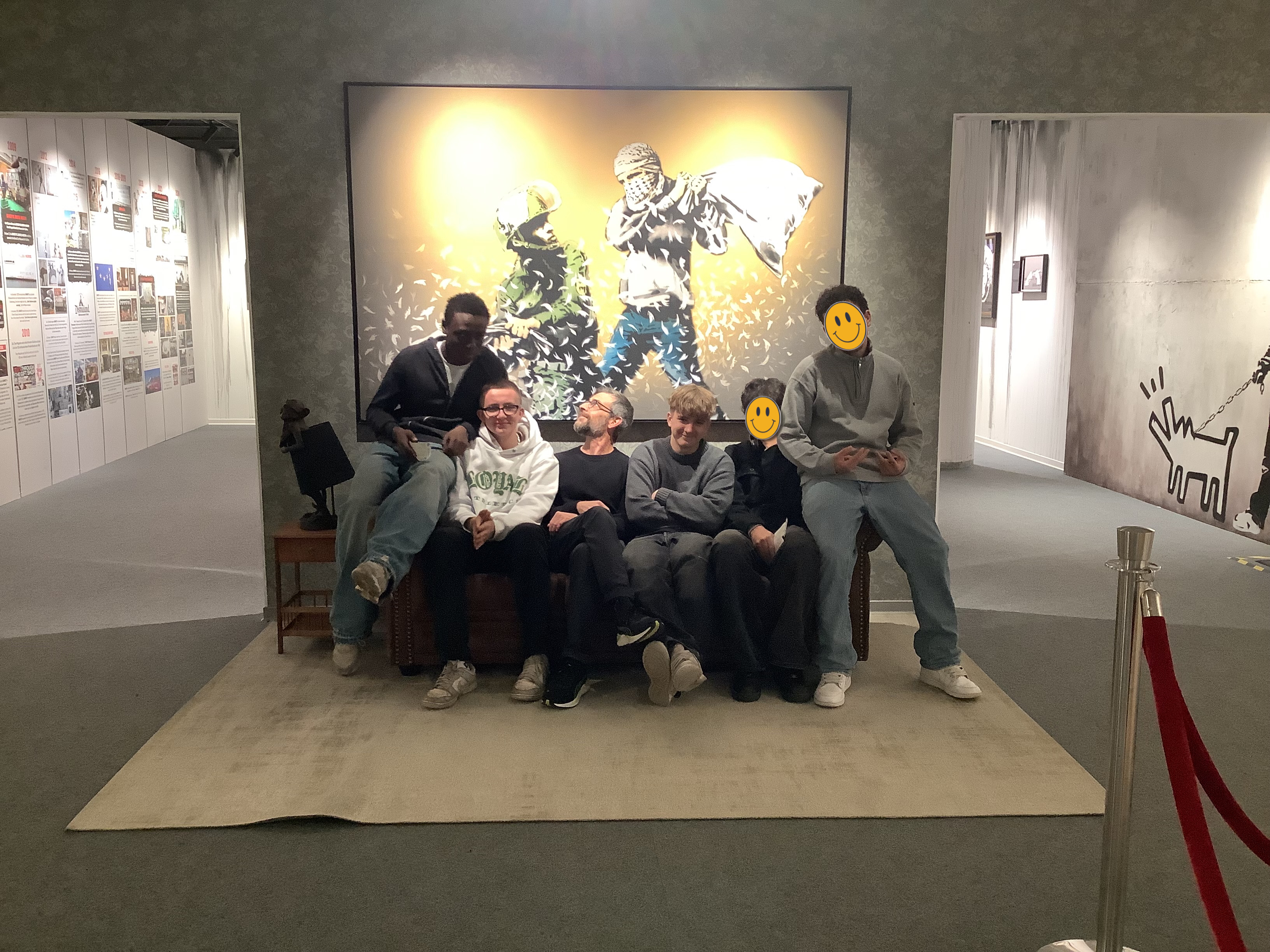 Der Tag begann erst nicht wie geplant, da uns von einer maskulinen Stimme aus dem Off mitgeteilt wurde, dass unser Zug nach Mannheim leider ausfalle und der nächste erst 45 Minuten später erscheinen würde. Jedoch entschied die Klasse sich dagegen diese 45 Minuten in der Kälte zu stehen und so fuhren wir mit dem Bus zum Hauptbahnhof und von dort aus mit der S-Bahn nach Mannheim. Dort angekommen begaben wir uns zu Fuß zum House-of-Banksy und wurden herzlichst empfangen. Banksy ist ein anonymer britischer Street-Art-Künstler, der mit provokativen, gesellschaftskritischen Werken weltweit bekannt wurde. Seine Kunst kritisiert Krieg, Konsum und Ungerechtigkeit. Zuerst liefen wir Schüler*innen in eigens gewählten Kleingruppen durch die Ausstellung. Wir sahen uns die Werke des Künstlers an und lernten viel über sein Weltbild, die politischen Botschaften und über seine Denkweise. Während unseres Aufenthalts liefen Kurzfilme über seine Kunst und Aktivitäten über verschiedene Leinwandinstallationen. Ein besonderes Highlight war der Teil eines von Banksy künstlerisch gestalteten U-Bahn-Abteils, in dem sich einige Schüler*innen gerne aufhielten.